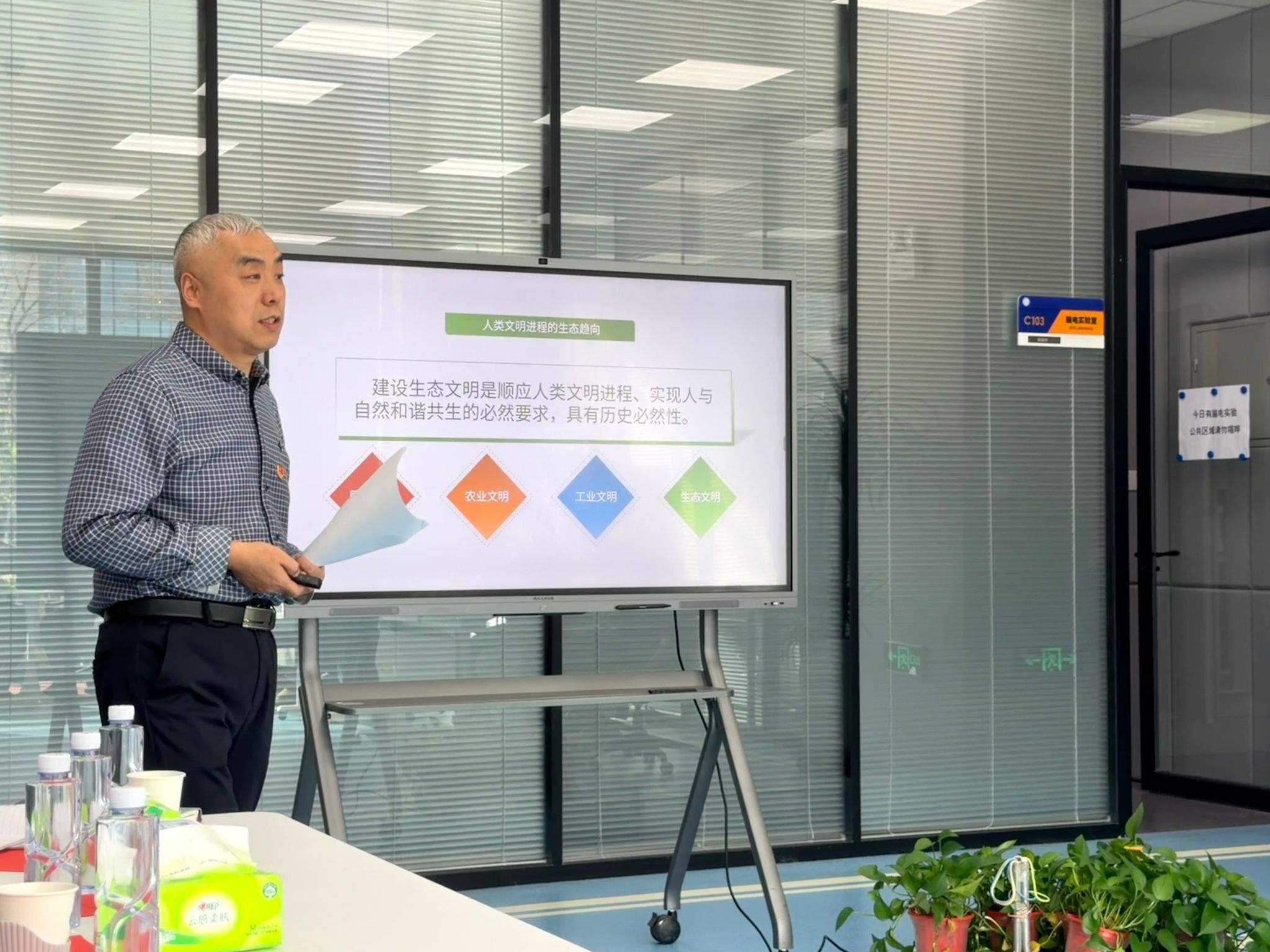 马院教工第三支部书记王宗军同志围绕党的二十届四中全会中关于生态文明建设的重要论述开展专题宣讲。他从推进美丽中国建设、构建人与自然和谐共生的现代化新路径、以制度建设推动生态文明体系完善等方面进行了系统阐释,深刻分析了生态文明基于中国式现代化全局中的战略意义,帮助党员进一步把握全会精神在新时代国家治理中的关键位置。智语实验室支部副书记申海同志介绍了实验室在人工智能与语言认知领域的研究特色以及近年来取得的阶段性成果,使与会党员对实验室的发展定位与我校科研布局有了更全面的认识。