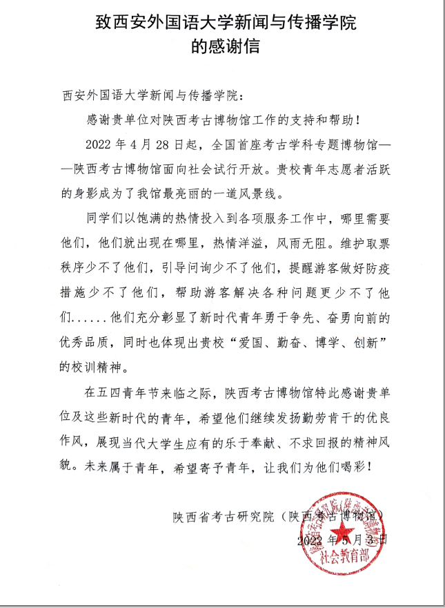 陕西考古博物馆为我校送来感谢信,信中对新闻与传播学院青年志愿者展厅服务、安检引导、文创引导等工作表示诚挚的感谢,对青年志愿者服务工作给予了充分肯定,展示了我校青年志愿者勇于担当、甘于奉献的良好精神风貌,获得了广大游客和工作人员的一致好评,为宣传大美陕西做出了自己的贡献。