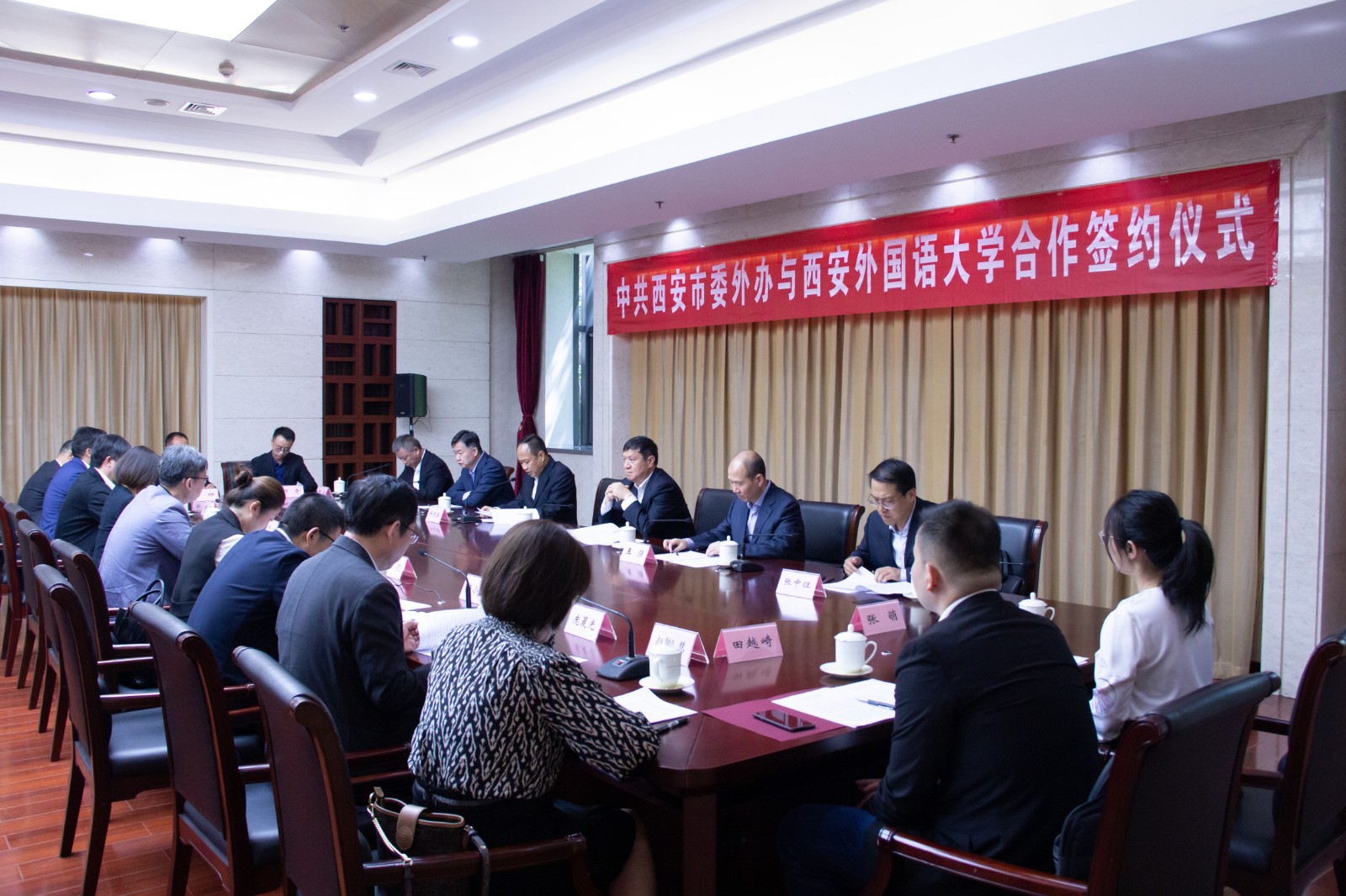 5月19日上午,我校与中共西安市委外事工作委员会办公室战略合作签约暨共建大学生实习实践基地签约揭牌仪式在西安市委办公厅会议室举行。西安市委常委、市委秘书长和文全,市委副秘书长蒋炜,西安市委外办主任强盛,副主任李晓燕、杨桢,我校党委书记白黎,党委副书记、纪委书记王强出席。西安市委外办礼宾管理处、友城交流处、对外友好城市交流中心、外事翻译中心和我校党委办公室·校长办公室、学工部·学生处·武装部、国际合作与交流处、高级翻译学院负责人参加仪式。