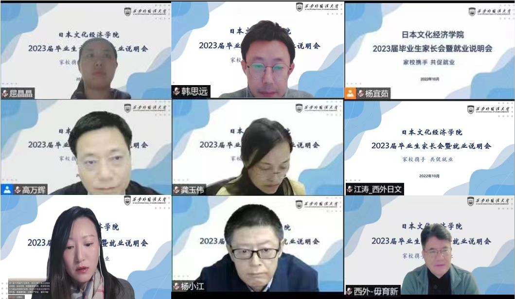 10月12日晚,日本文化经济学院以腾讯会议方式召开2023届毕业生家长会暨就业说明会,为2023届毕业生家长和同学提供就业指导和就业信息,帮助毕业生树立正确就业观和择业观。学校就业指导中心主任杨小江、学院党政班子全体成员、教师代表、毕业班辅导员及2023届全体毕业生及其家长参会。会议由学院党委书记高万辉主持。
