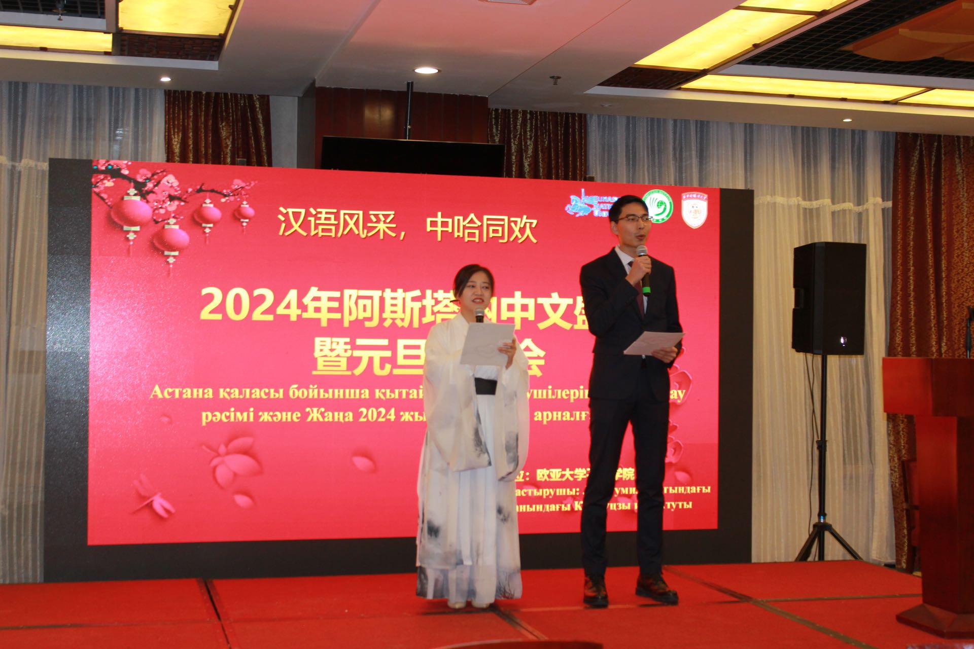 当地时间12月22日,我校哈萨克斯坦欧亚大学孔子学院在哈萨克斯坦首都阿斯塔纳北京大厦举办了“汉语风采,中哈同欢”2024年阿斯塔纳中文盛典暨元旦联欢会庆祝活动。中国驻哈萨克斯坦大使馆临时代办邢芳芳、多家中哈教育机构与企业、民间协会的负责人、中国在哈留学生代表、中外媒体、孔院全体师生等200余人参加庆祝活动。