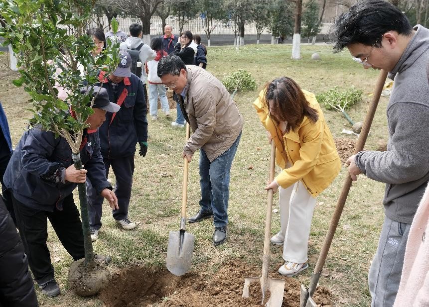 后勤管理处董士成详细介绍了树木种植与养护的相关知识和技巧,并向各党支部分发了树苗与植树工具。党员们分工合作、配合默契,扶苗正株、挥锄回泥、浇水夯土,植树现场到处是忙碌的身影,经过半个多小时奋战,4颗桂花树树苗昂然挺立,为校园增添了清新绿意。“党建红”引领“生态绿”这一美好画面,使美丽校园更显勃勃生机。