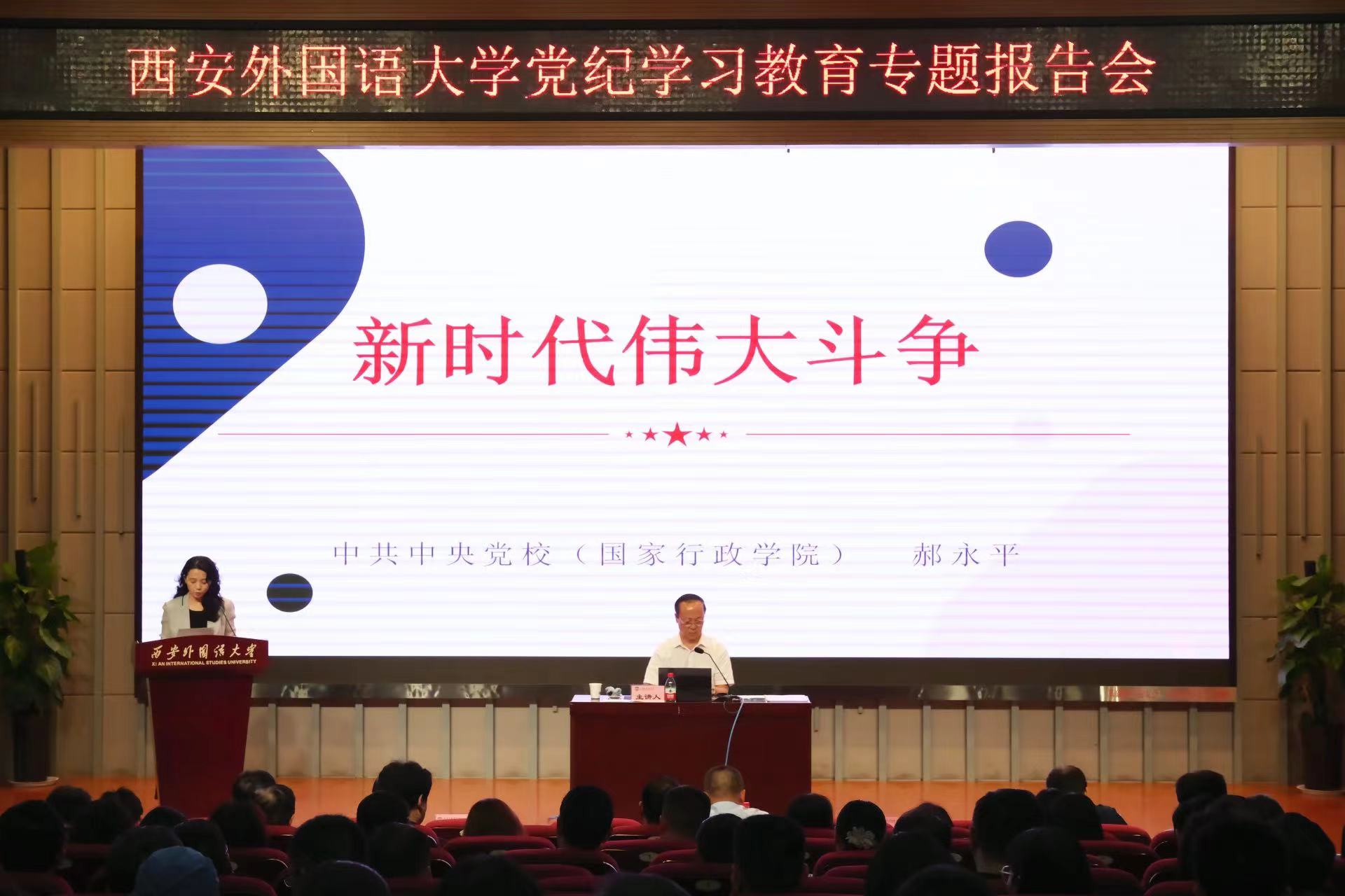 6月4日下午,我校举办党纪学习教育专题报告会,中央党校(国家行政学院)郝永平教授以“新时代伟大斗争”为题作报告,校领导,处级干部,党支部书记,师生党员代表参加报告会,会议由党委副书记马洁主持。