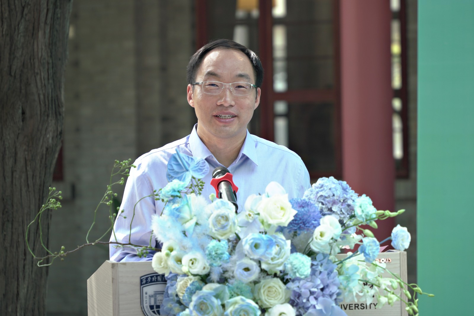 8月19日,“外文社图书进校园”启动仪式暨西安外国语大学“外文社书屋”揭牌仪式在我校中华文化体验中心举行。中国外文局副局长于运全、中宣部国际传播局专项工作处处长季萌、陕西省委宣传部副部长单舒平、外文出版社社长胡开敏、外文出版社总编辑许荣、陕西省委教育工委委员冀映秋、西安外国语大学校长吴耀武、中国外文局教育培训中心主任王育宁、中国外文局翻译院副院长邢玉堂、西安外国语大学党委副书记马洁、教育部全国翻译专业学位研究生教育指导委员会委员党争胜等出席仪式。仪式由教育部高等学校外国语言文学类专业教学指导委员会委员姜亚军主持。