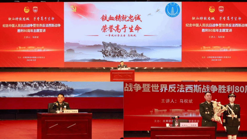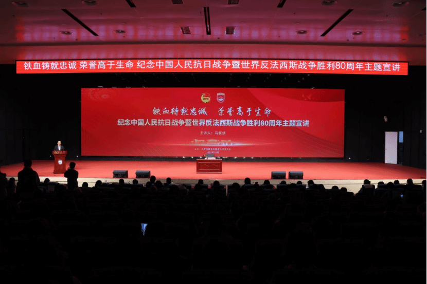 10月22日下午,纪念中国人民抗日战争暨世界反法西斯战争胜利80周年主题宣讲活动在我校启智楼报告厅顺利举办。一等战功荣立者、原西安警备区政治部主任、陕西省南泥湾精神研究会副会长、陕西省爱国主义英模报告团荣誉团长马权斌,以《铁血铸就忠诚,荣誉高于生命》为题,为全校千余名师生带来了一场震撼人心的爱国主义专题讲座。活动由我校党委副书记王强主持。