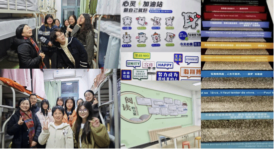 班会结束后,邓滢一行走访2A学生宿舍,与同学们交流学习生活,强调诚信融入日常,鼓励劳逸结合;同时参观楼宇公共区域,点赞二层自习室,驻足“心灵加油站”便笺板,查看“特色语言文化墙”,肯定宿舍楼宇育人环境建设。