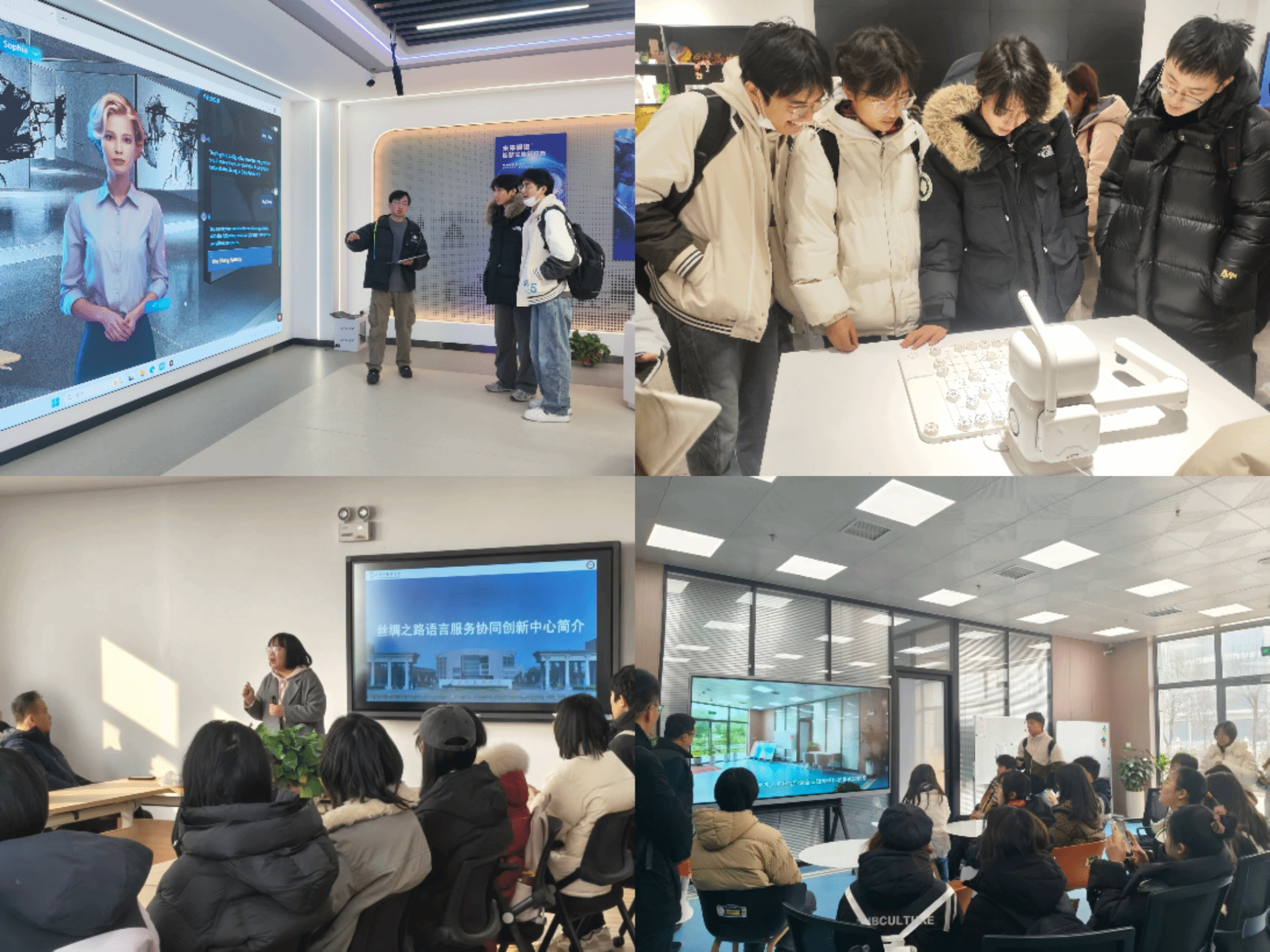 参访师生一行先后走进人工智能与语言认知神经科学重点实验室、人工智能产教融合实训中心、丝绸之路语言服务协同创新中心、国际传播中心及丝路青年众创空间,近距离观摩语言认知神经科学前沿研究成果,详细了解我校人工智能与外语教学融合的实训课程体系、校企合作模式,以及多语种翻译服务、国际传播人才培养、学生语言类创新创业项目孵化等实践成效。作为“外语+葡萄酒”项目落实单位,英文学院重点介绍了学院在复合型外语人才培养、跨学科课程体系搭建等方面的经验。