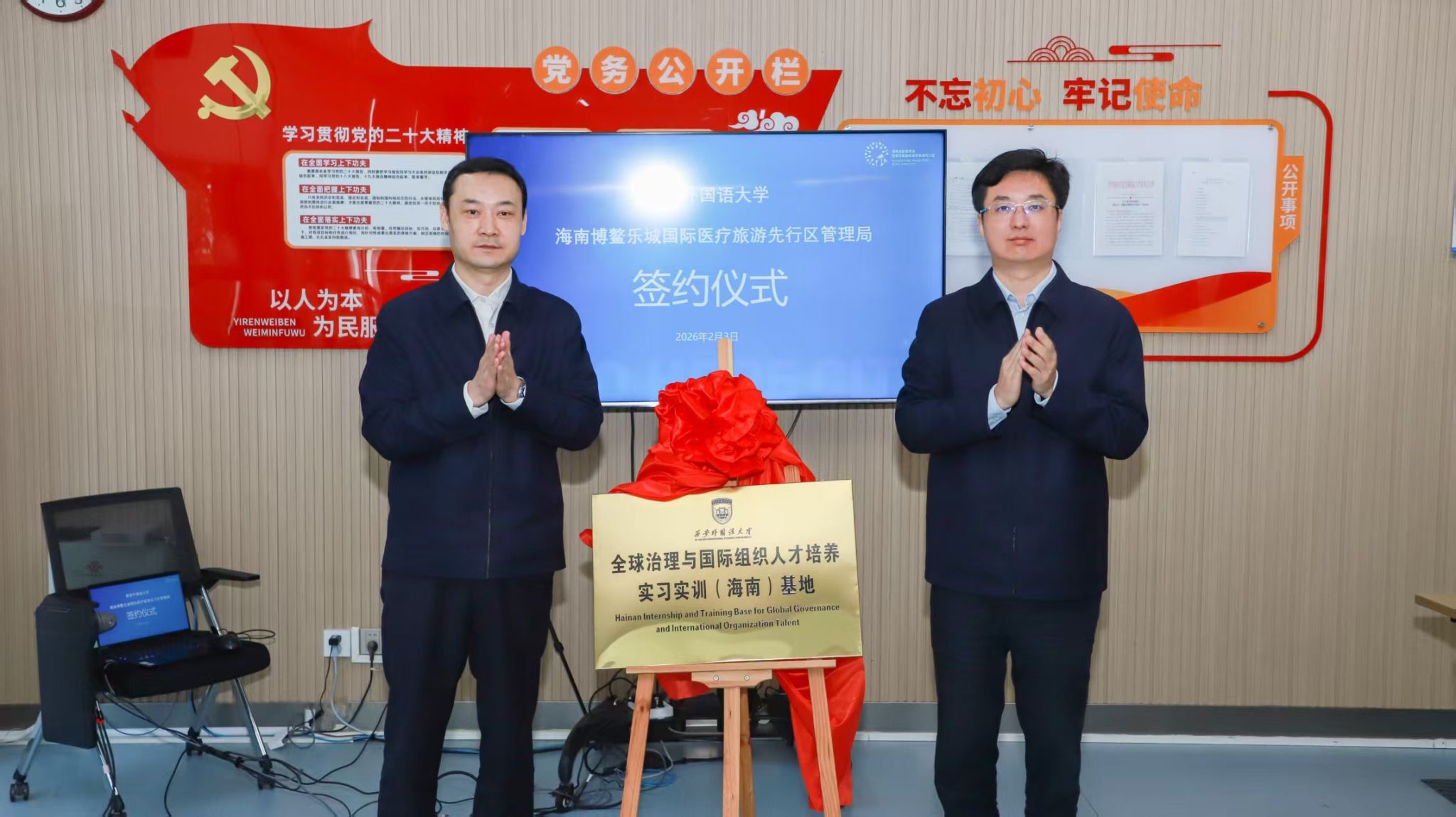 2月3日,调研组赴乐城管理局开展调研。双方就开展校地、校企合作达成一致意见,“西安外国语大学全球治理与国际组织人才培养实习实训(海南)基地”正式揭牌成立。学校分别与乐城管理局、上海交通大学医学院海南国际医学中心、上海交通大学医学院附属瑞金医院海南医院(海南博鳌研究型医院)、博鳌一龄生命养护中心、海南梅赛尔医院、博鳌超级医院签署合作协议,全面建立“局-校-企”三方联动机制,进一步拓展了在校学生实习实训渠道,健全实习就业机制,助力学校人才培养质量提升和学生就业工作。