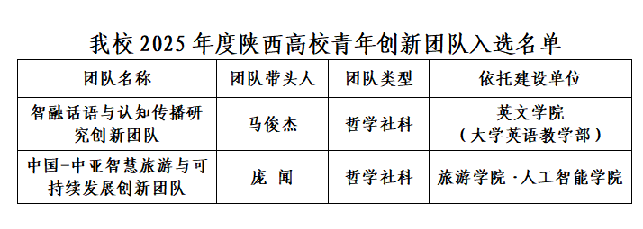 近日,陕西省教育厅发布了《关于公布2025年度陕西高校青年创新团队入选名单的通知》,我校推荐的两支哲学社会科学团队全部入选。全省此类团队仅设20席,我校与西安美术学院并列榜首。